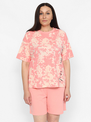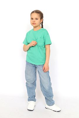 Футболка со спущенным плечом и короткими рукавами. Спереди карман декорирован ришелье. Горловина круглая, обработана притачной бейкой. По ростку горловины шов притачивания закрыт долевиком.