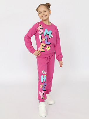 Джемпер для девочки с длинными рукавами. Горловина, рукава и низ изделия с эластичной резинкой. На полочке декоративный принт с блестящим эффектом и надписью - "Улыбнись". Брюки-джоггеры без карманов. Пояс притачной, со вставленной внутрь резинкой. В пояс вставлен шнур. Спереди деворативный принт с блестящим эффектом и надписью - "Привет". Внизу манжеты.