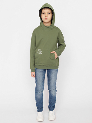 Толстовка для мальчика с капюшоном и карманом "кенгуру" спереди. Капюшон с подкладкой. Рукава длинные, с манжетами по низу. Низ изделия оформлен притачным поясом. Пояс и манжеты выполнены из полотна с эластаном. На левый рукав настрочена жаккардовая этикетка, на карман нанесен принт.