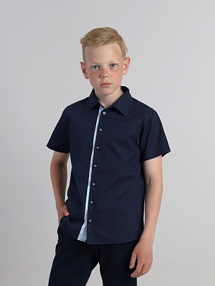 Рубашка классическая, полуприталенного силуэта, с коротким рукавом из хлопка. Воротник обтачной с притачной стойкой. Планка оформлена декоративным кантом контрастного цвета.