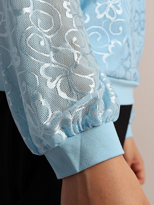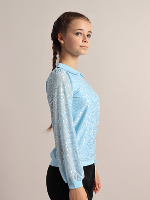 Джемпер для девочки с длинными рукавами и отложным воротником. Рукава из сетки с манжетами из кулирки. Полочка двойная - нижний слой из кулирки, верхний из сетки. Сзади застежка на пуговицу.