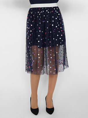 Нарядная двухслойная юбка для девочки из сетки с блестящими кружочками "конфетти". Эластичный пояс с люрексом. Подкладка выполнена из хлопкового трикотажа. Подкладка короче верхнего слоя сетки.