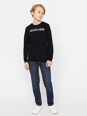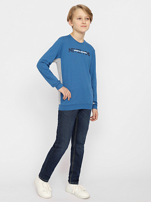 Джемпер для мальчика с длинными рукавами и притачным поясом из полотна с эластаном. Нижние срезы рукавов обработаны притачными манжетами из полотна с эластаном. Горловина круглая, обработана эластичным воротником.