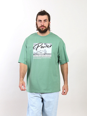 Футболка oversize со спущенным плечом, с коротким рукавом. Горловина круглая, обработана притачной бейкой из рибаны с лакрой. Плечевые швы смещены на перед и отстрочены. По переду вдоль правого бокового шва - текстовый принт.